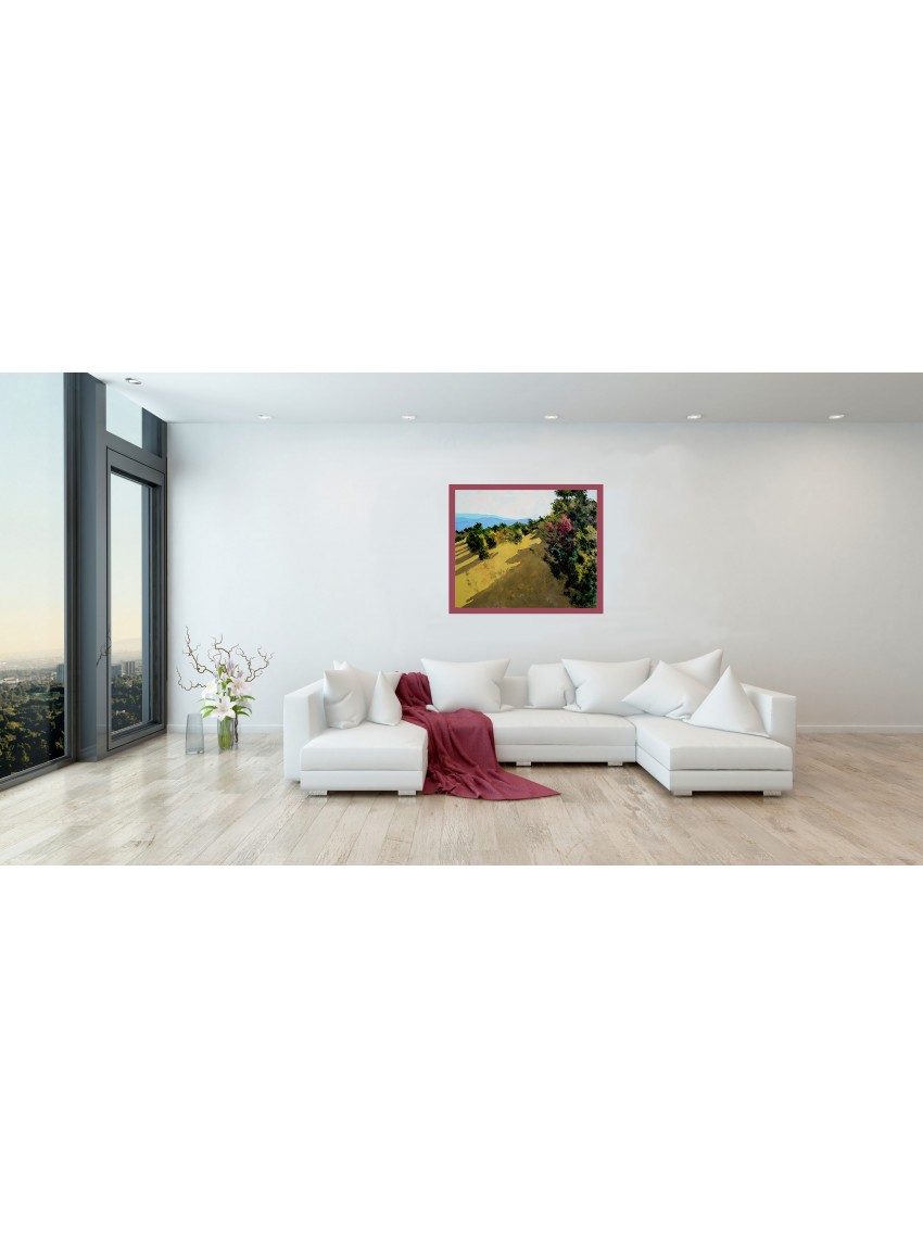 Ich habe dieses Gemälde von der Spitze des Hügels nach unten gemalt, was aufgrund der schrägen Perspektive diese besondere Aussicht bietet.