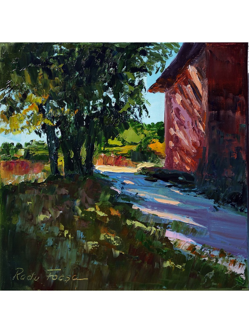 An einem sehr heißen Tag im Sommer 2023, wenn die Sonne gnadenlos brennt, ist es schwierig, im Freien an dem Muster zu arbeiten. Als ich diese Ecke in der Nähe eines Gebäudes auf dieser Farm fand, war ich sehr froh, meine Staffelei aufstellen zu können.Die mit Wärme gesättigte Luft brachte den Farben neue Energie. Die Ockertöne begannen in Richtung Magenta zu vibrieren und die Blautöne näherten sich dem Lavendel.Für einen Maler war es eine sehr interessante Erfahrung.