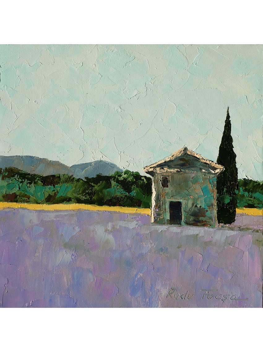 Es ist fast das Klischeebild der Provence. Ein Schuppen für Arbeiterwerkzeuge, ein Lavendelfeld und die Zypresse, ein emblematischer Baum von der Provence bis in die Toskana. Aber ich habe es nicht absichtlich gemacht. Überall auf den Feldern, auf denen ich meine Staffelei zum Malen aufstellen werde, gibt es viele solcher Schuppen. Sie wurden früher verwendet, um Werkzeuge und manchmal sogar Arbeiter zu schützen, die zu Fuß aus der Ferne kamen und bis zum Ende der Ernte einige Tage auf den Feldern blieben.