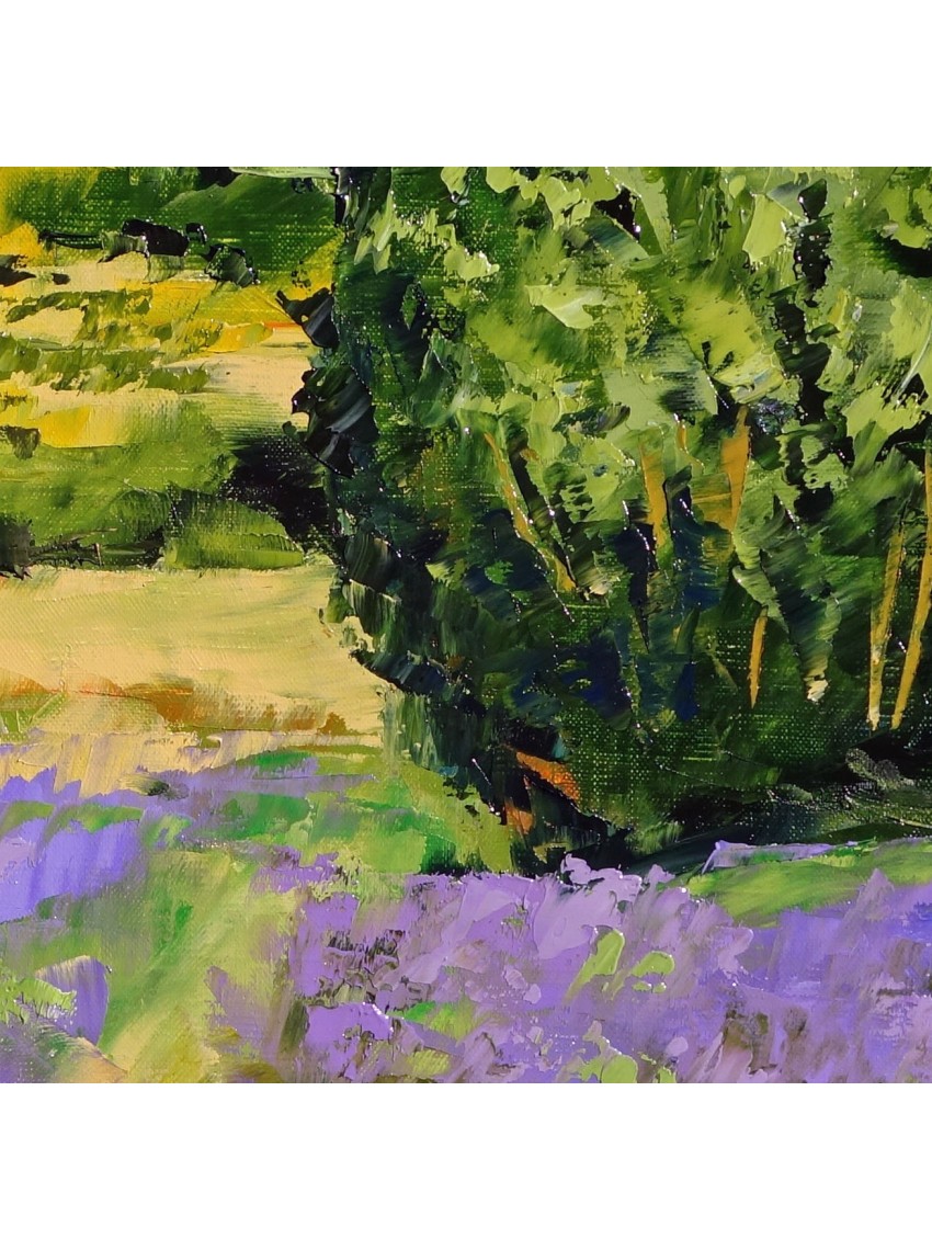 represents a Landscape with lavander fields in Provence in the Luberon, painted in oil on canvas, near the village of Roussillon in the Luberon.