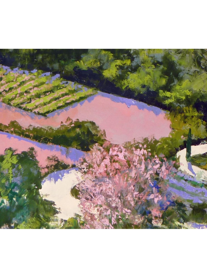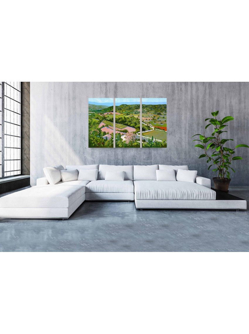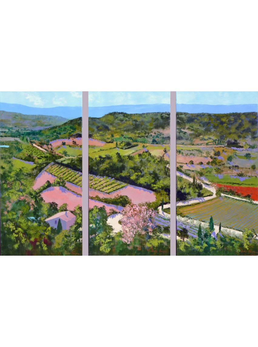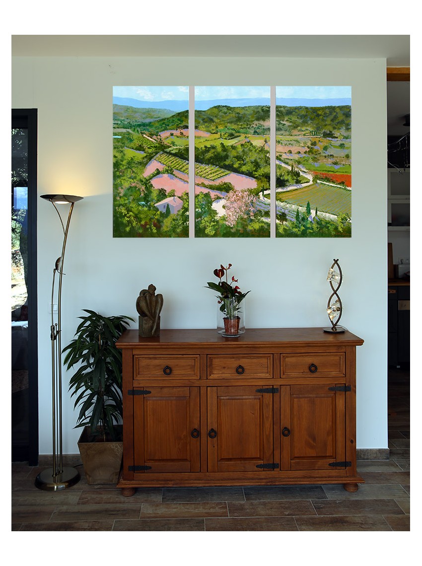 Composée de trois panneaux de 50 x 100 cm avec un espace de 4 cm entre les panneaux qui représente un paysage vu du haut du village de Gordes