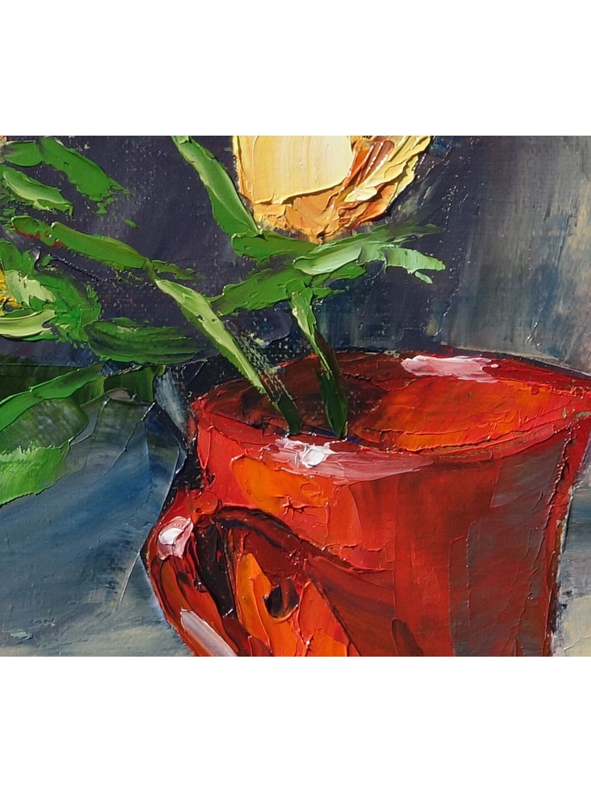 Pictură cu cuțitul făcută în atelier cu flori din grădina artistului.