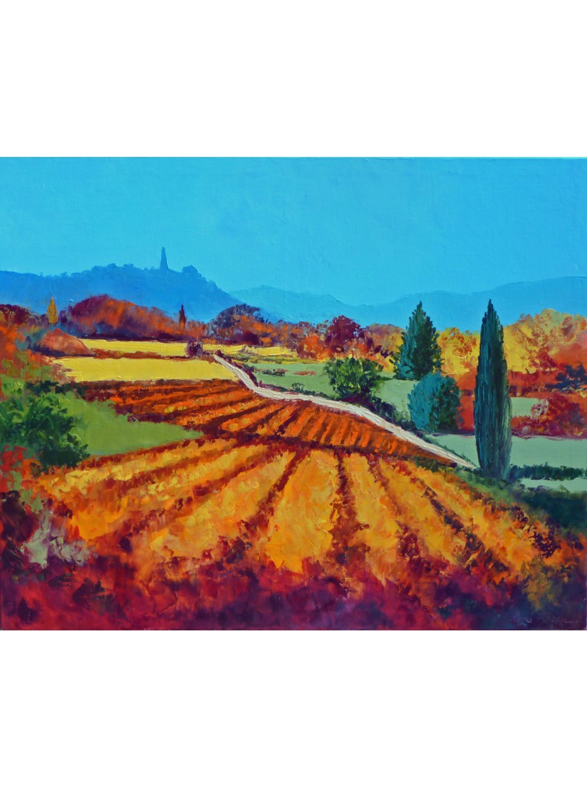 Pictura facută în aer liber în septembrie, lânga satul Villard, în Luberon.