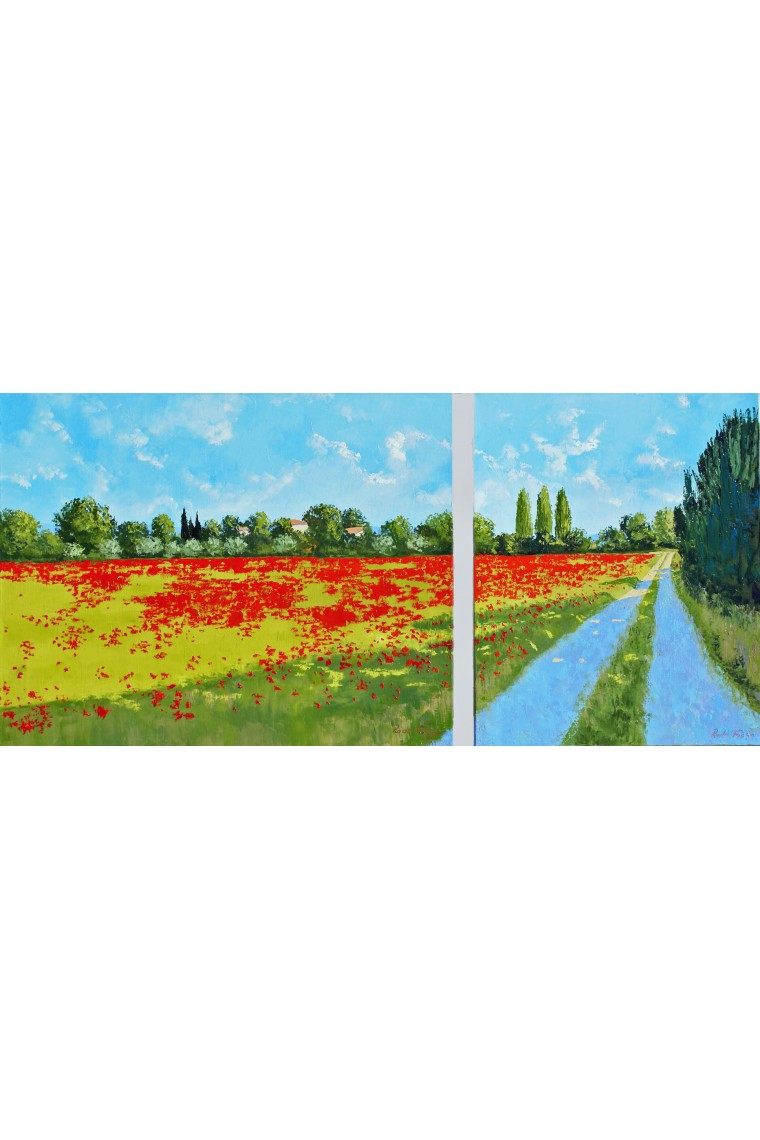 Peisaj diptyque în doua pânze de 73 x 60 si 73 x 92 cm cu un Câmp cu maci lînga satucul Oppede le Vieux în Provence - Pictura realizata în atelier dupa schite pe motif în aer liber. Tablou de cumparat direct de la pictor.